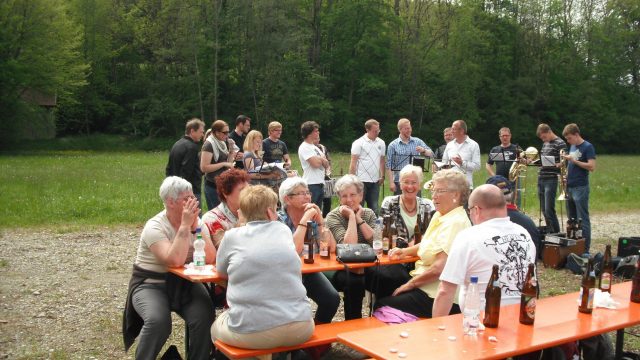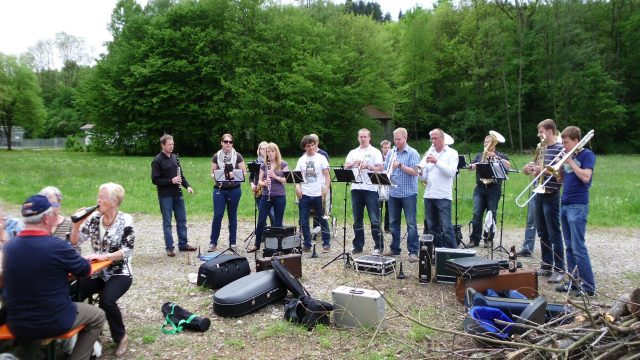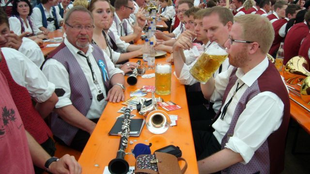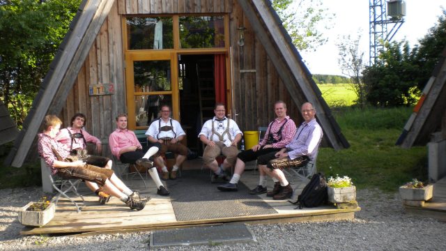 Der Westerwälder Bus traf gegen 12:00 Uhr in der Unterkunft in Legau ein (Das Feriendorf Umweltstation). Hier werden die Musikanten in 9-Mann „Nur-Dach-Hütten“ untergebracht. Die passiven Mitglieder finden im gegenüberliegenden Gebäude ihren Unterschlupf für die kommenden Tage. Nach kurzer Erfrischung und einer kleinen Erholung von der längeren Busfahrt, macht man sich gleich auf den Weg ins große Festzelt. Dort warten bereits die Legauer Musikfreunde und es wird gleich auf den Geburtstag mit einem „Gläschen“ Hellbier bzw. Weizenbier angestoßen. So feiert man unter den Klängen der verschiedenen Musikvereine den restlichen Tag bis in den Abend hinein weiter.