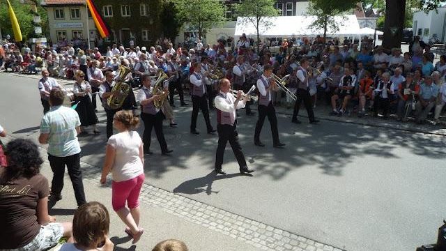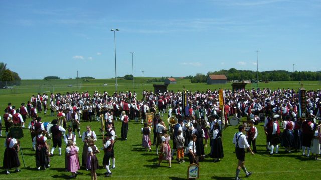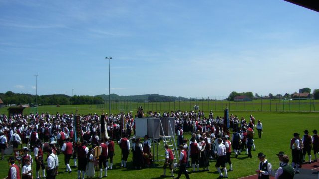 Nachdem die „Reisegruppe“ des Musikvereins Hundsangen am Samstagabend in Trachten und Dirndl feierte, werden am heutigen Sonntag die Musikvereinuniformen übergestreift. Der große Festumzug, sowie ein Gemeinschaftskonzert aller mitwirkenden Musikvereine findet statt. Die über 70 teilnehmenden Musikkapellen bringen es auf eine unglaubliche Zahl von über 2.500 Musikerinnen und Musiker. Insgesamt werden drei Musikstücke gemeinsam aufgeführt, bevor die Vereine einzeln zum großen Umzug durch Legau aufbrechen. Eine Musikkapelle nach der anderen bricht mit jeweils 40 bis 60 Musiker/innen auf. Da vom Musikverein Hundsangen nicht alle Musiker am Ausflug nach Legau teilnehmen konnten, spielen wir mit einer „etwas“ kleineren Besetzung auf.